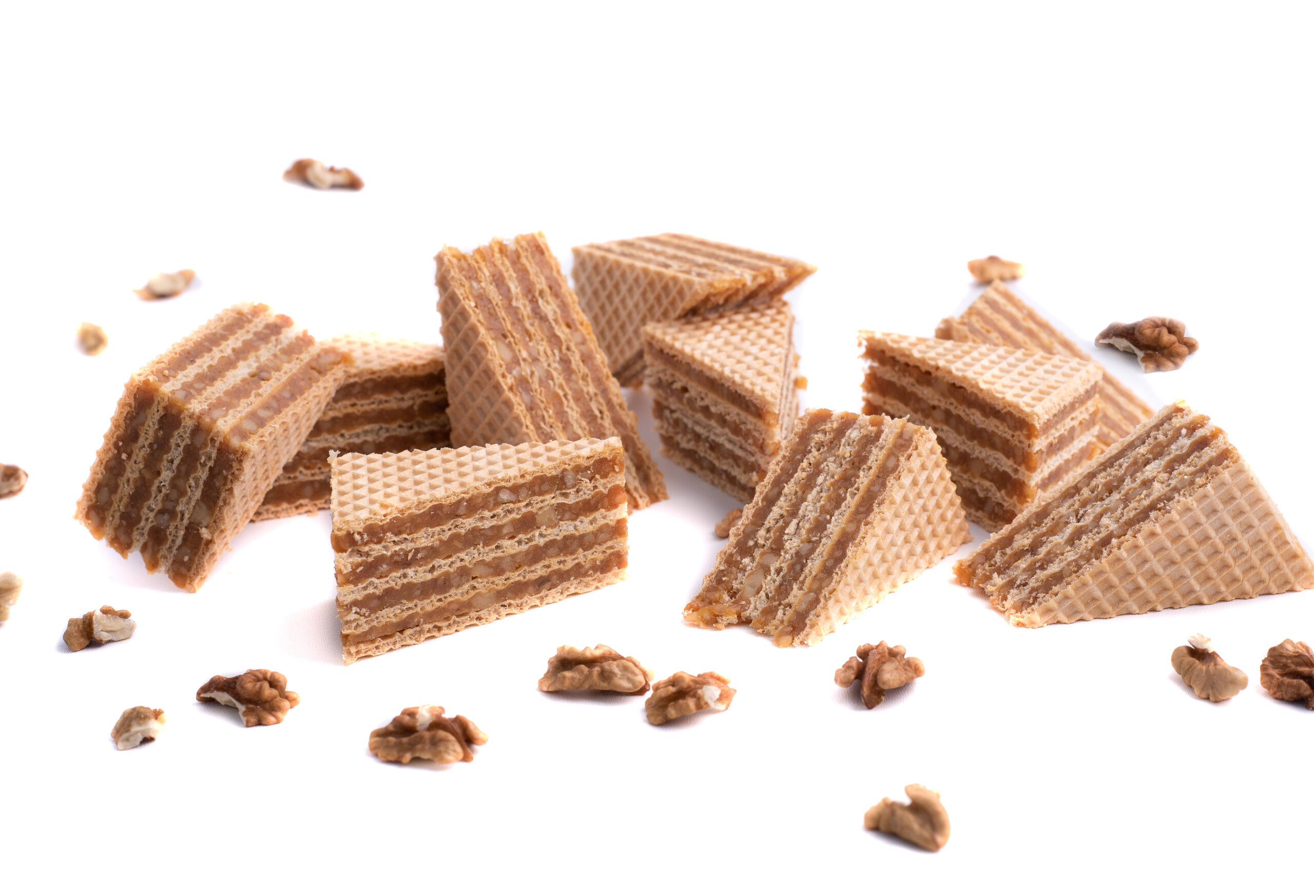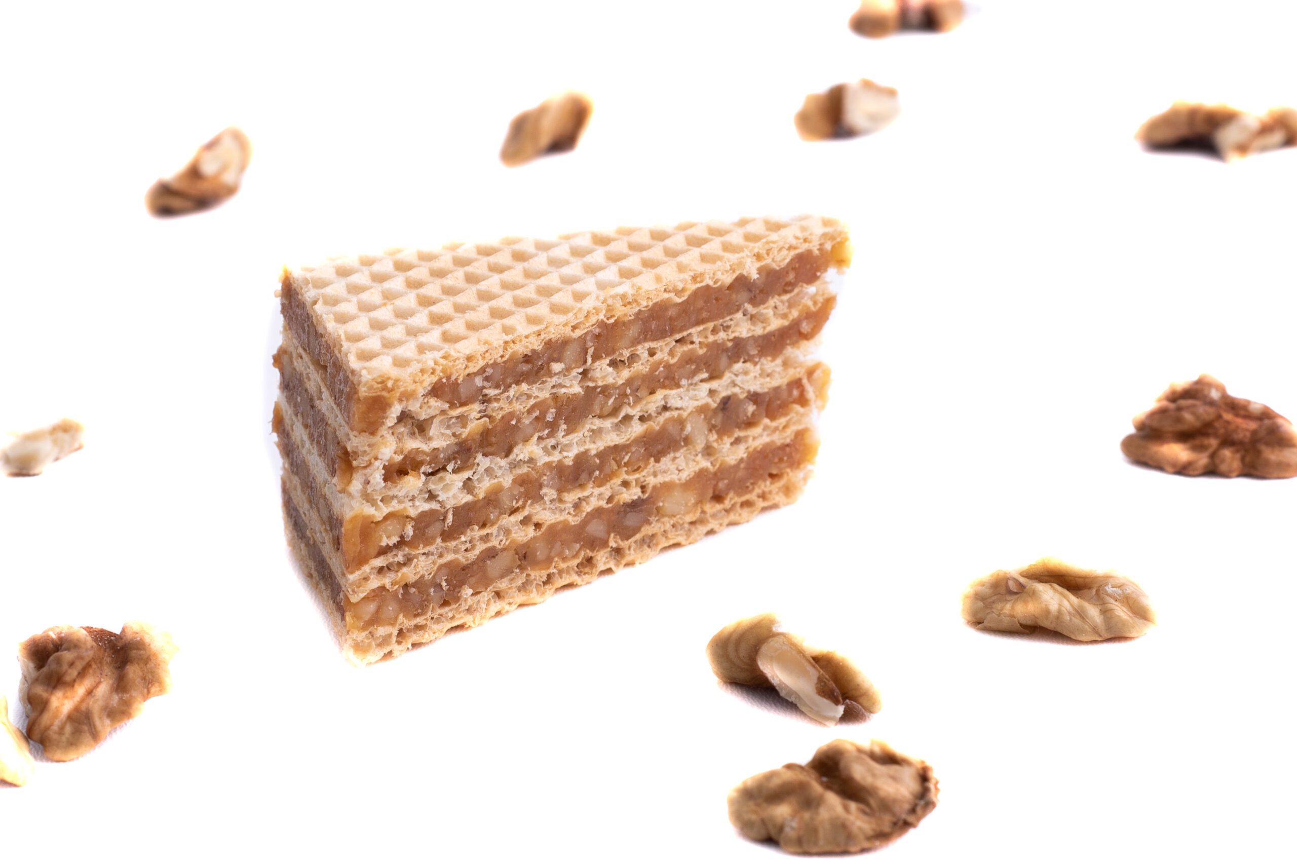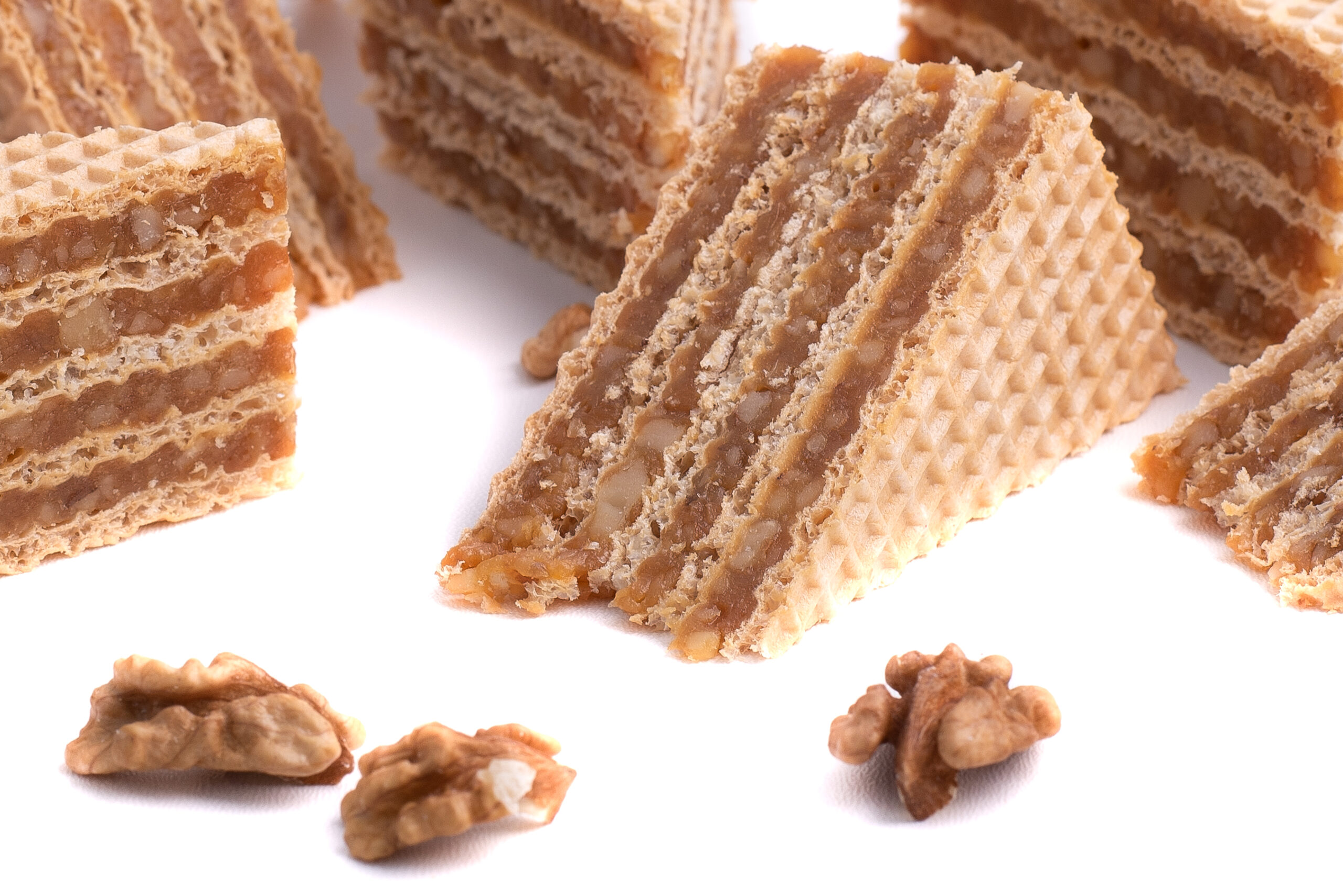 Naše domácí sušenka. Pečené oplatky plněné poctivou vrstvou karamelu a vlašských ořechů.
