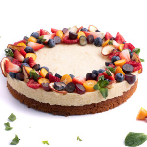 Světlý korpus promazaný tvarohovou náplní s ovocem uvnitř, zdobený čokoládovou ganache a ovocem. 12 porcí.