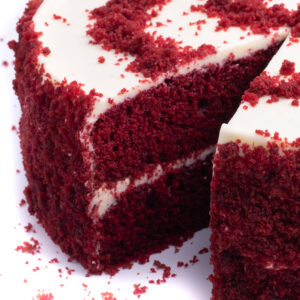 Jemný korpus zářivě červené barvy, sladký krém z cream cheese s chutí citrónové šťávy. Decentní chuť podmáslí, 12 porcí.