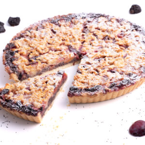 Linecký koláč s vařenou makovou náplní a bohatě zdobený švestkami, zasypaný drobenkou. 12 porcí.