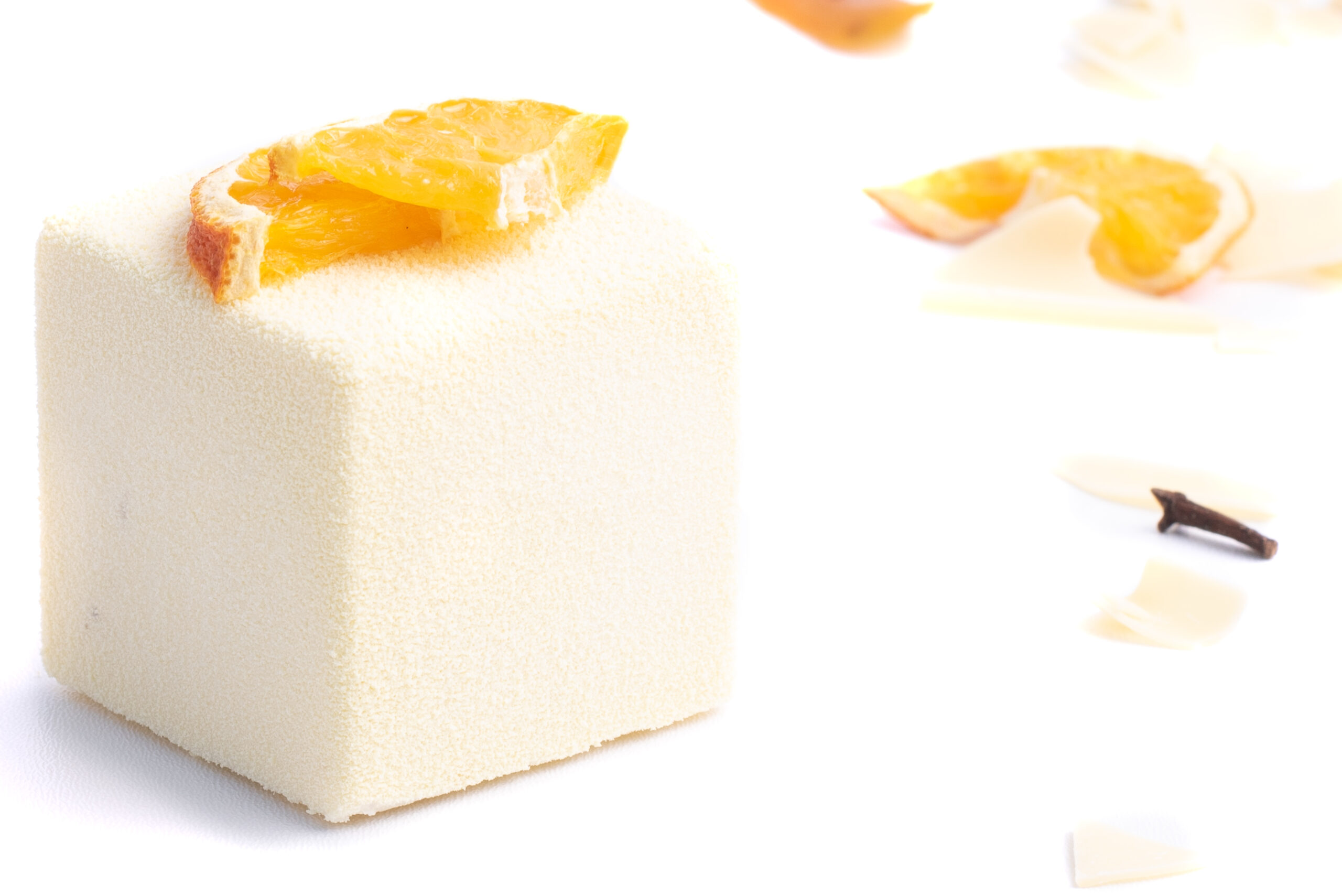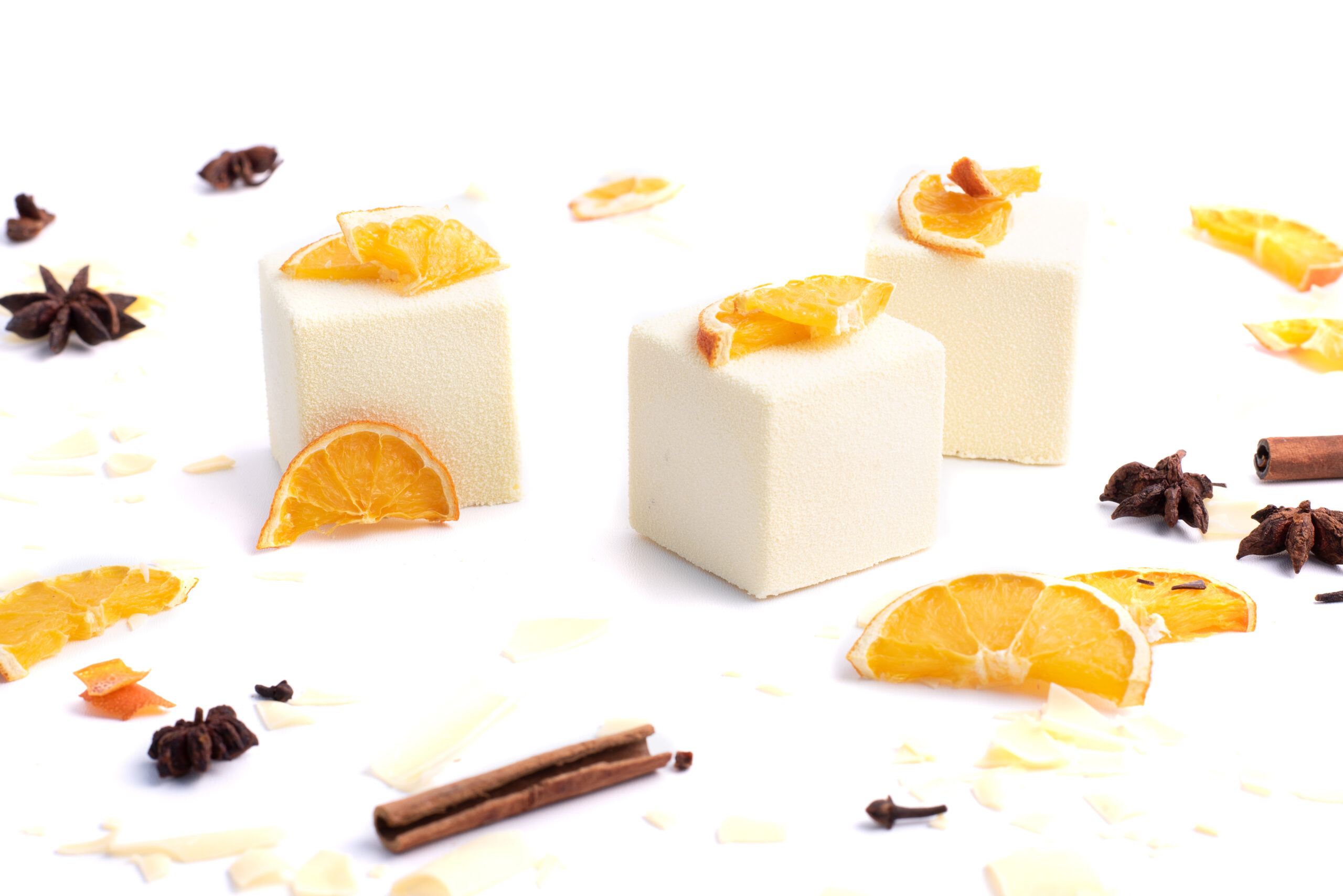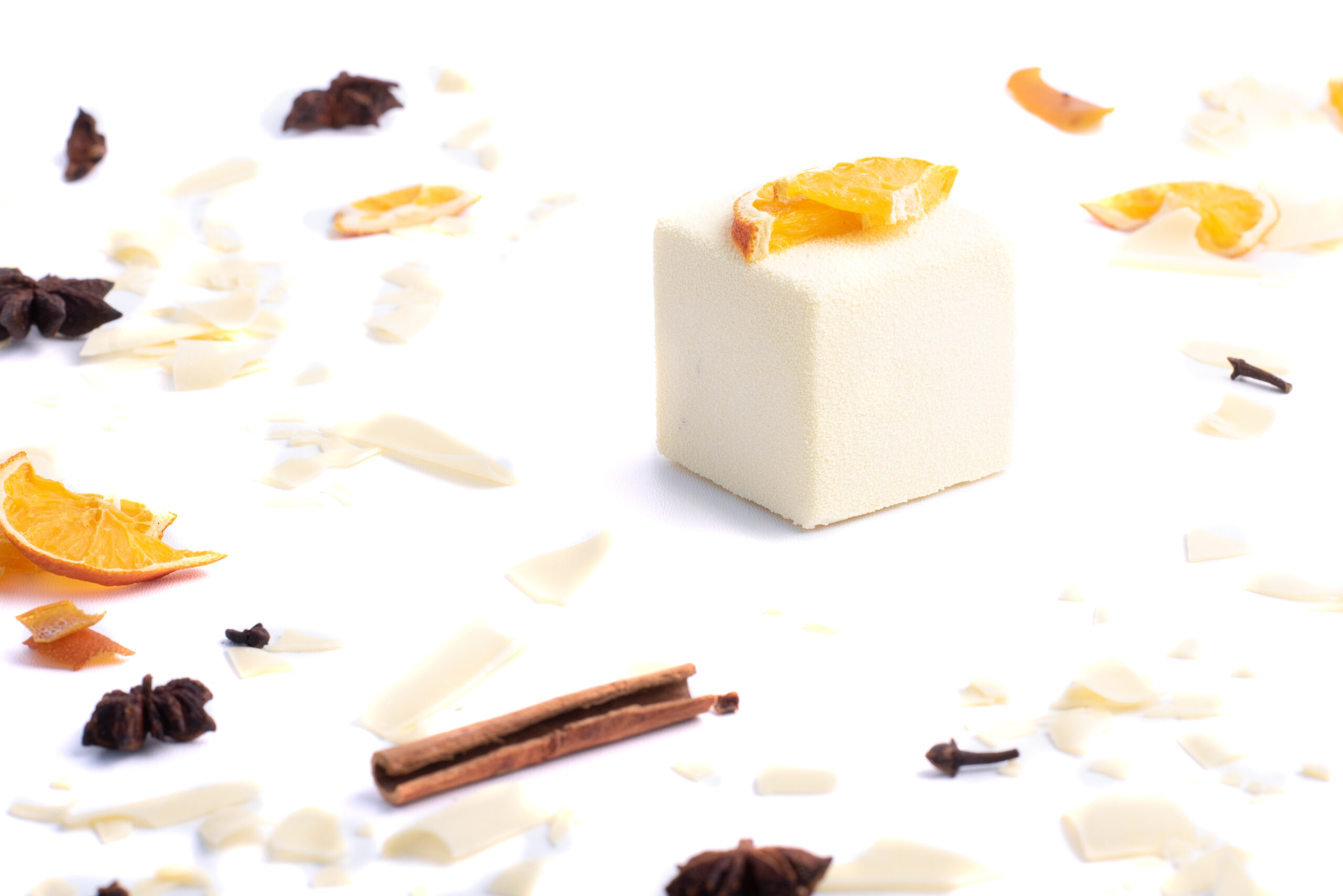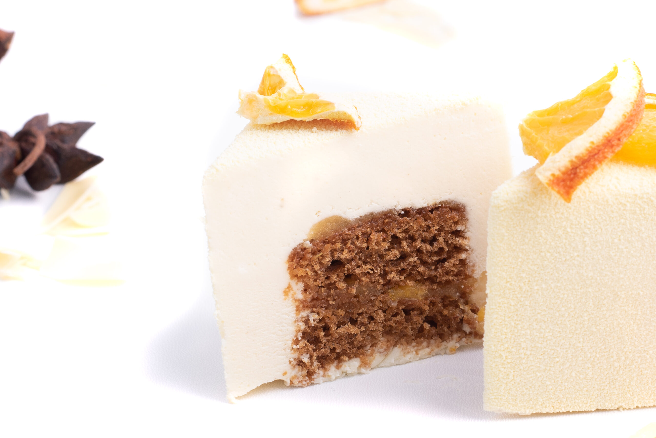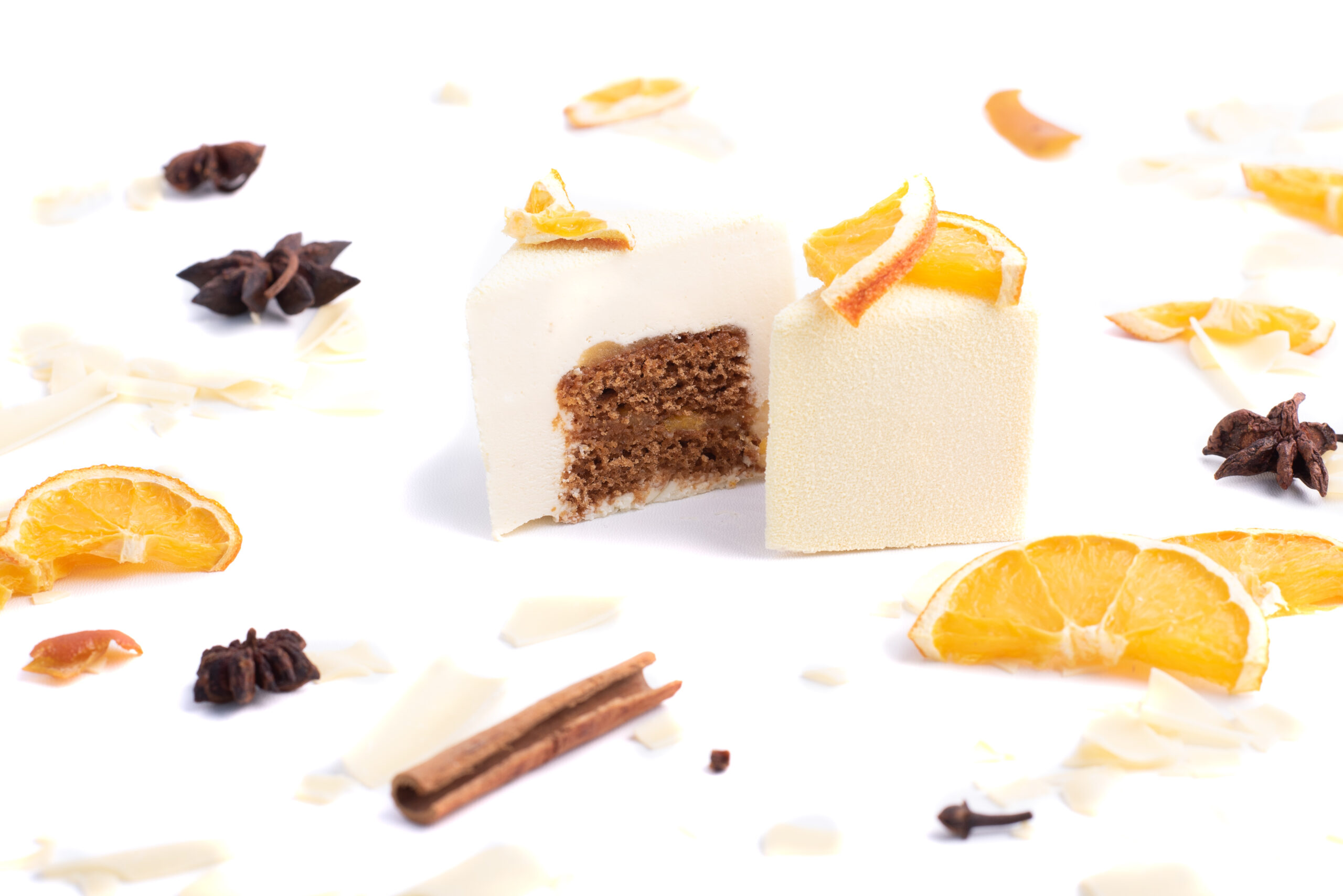 Kořeněný perníkový korpus provoněný skořicí a zázvorem, pomerančové compote, vanilkový mousse s bílou čokoládou.