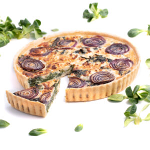 Tradiční francouzský slaný koláč z křehkého těsta se smetanovou náplní a muškátovým oříškem, špenátem a balkánským sýrem. Zdobený červenou cibulí. 8 porcí.