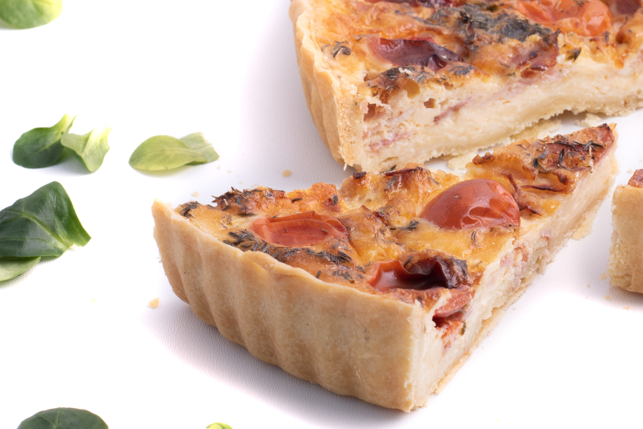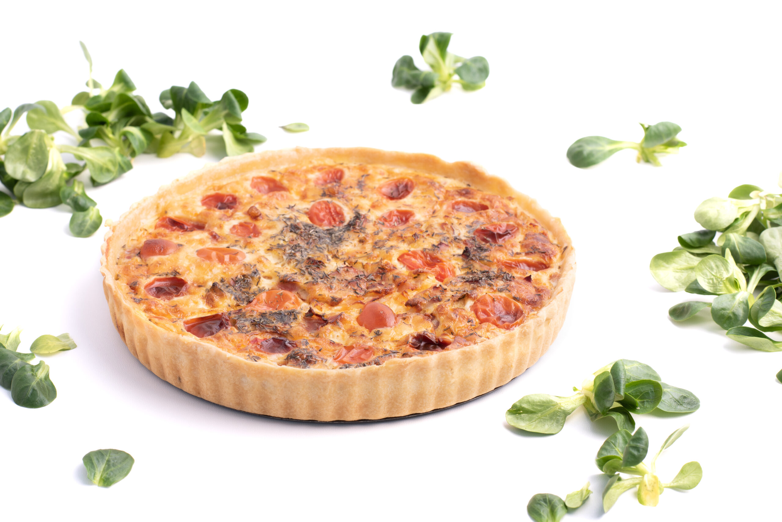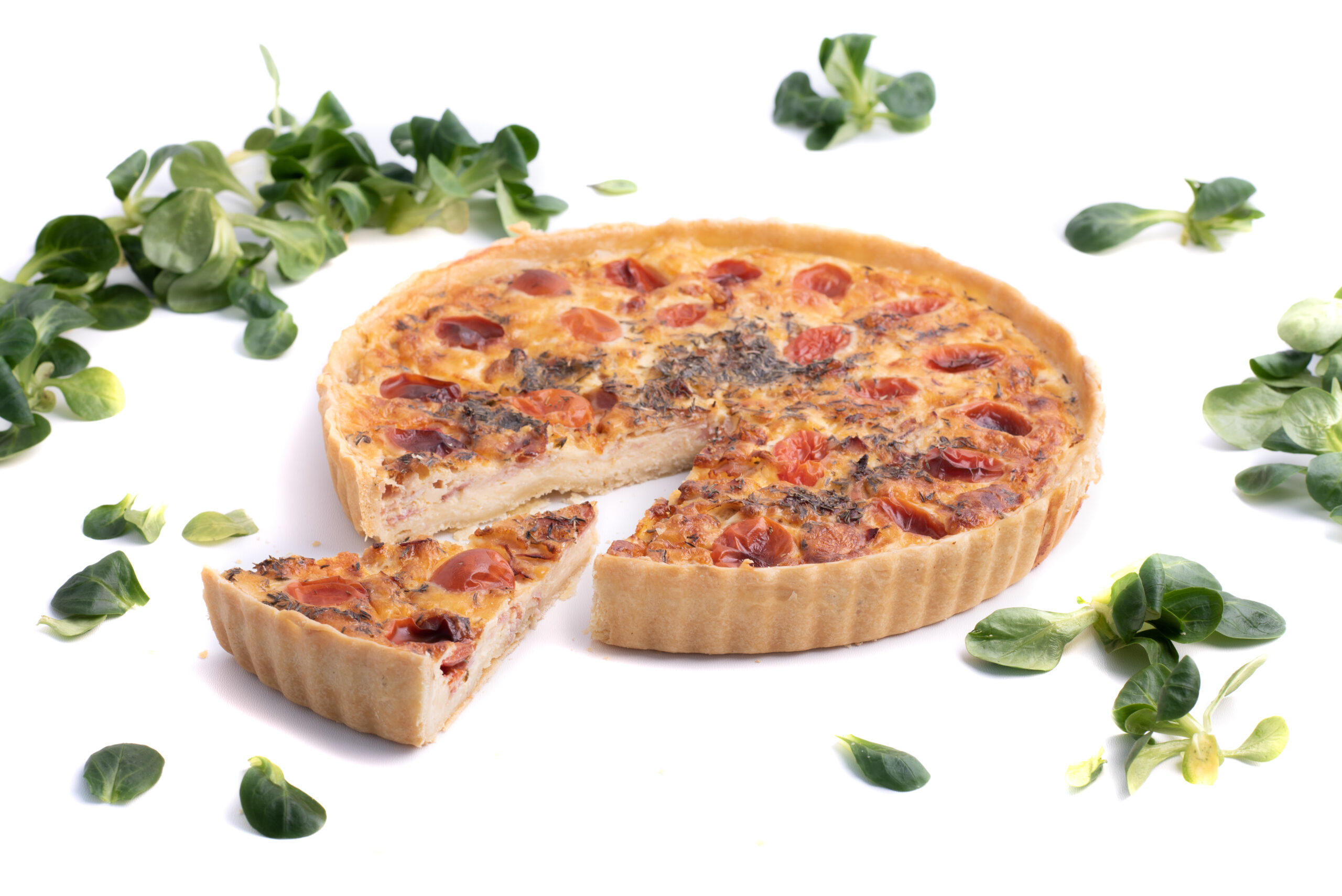 Slaný francouzský koláč z křehkého těsta se smetanovou náplní, slaninou a sýrem. Zdobený rajčaty a tymiánem. 8 porcí.