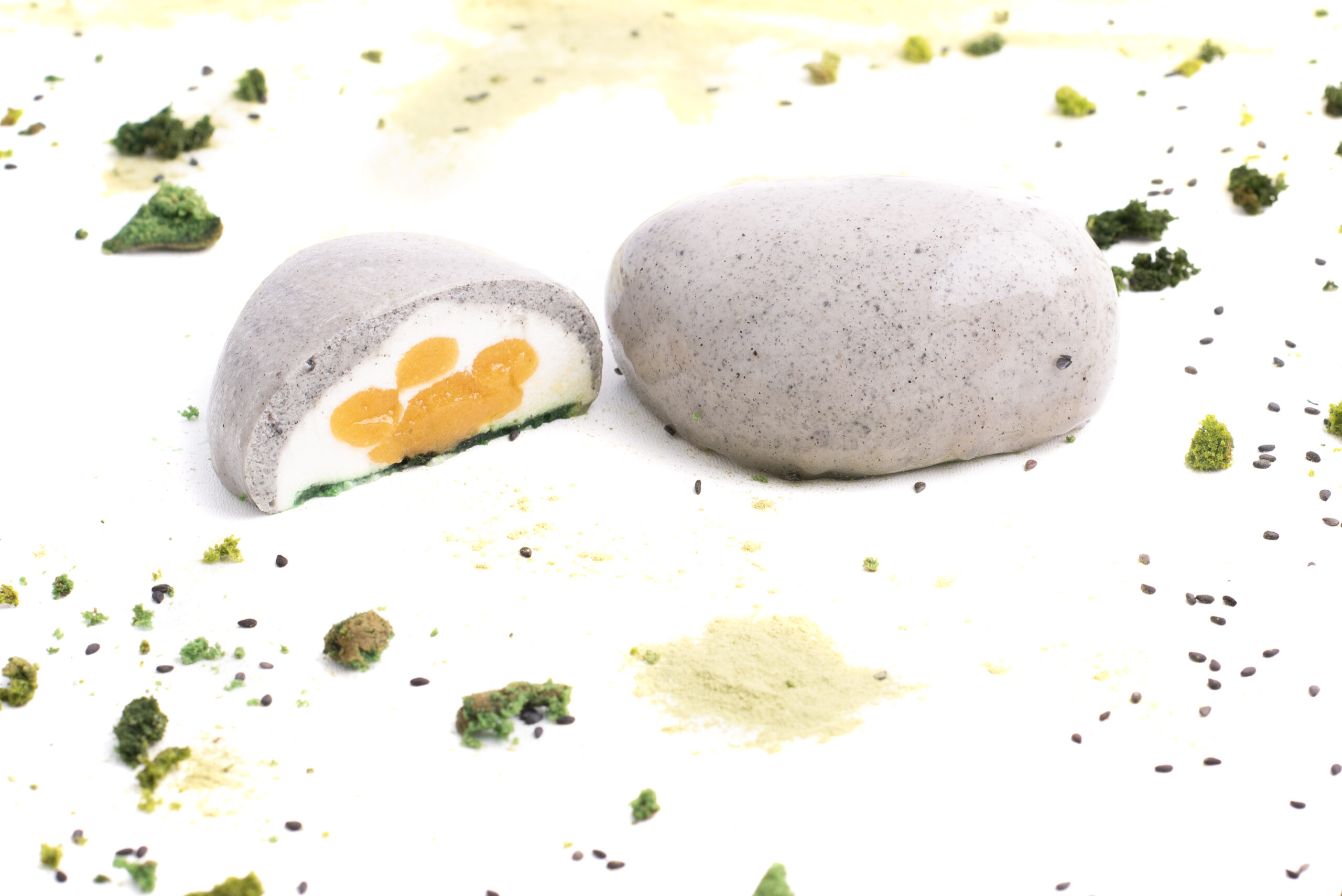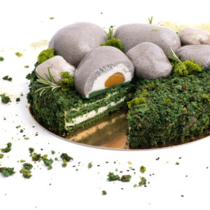 Na první pohled připomíná hromadu kamení, ale uvnitř je plný svěžích chutí: mousse z černého sezamu, kokosový mousse, gel z yuzu, manga a maracuji, matcha lehký piškot.
